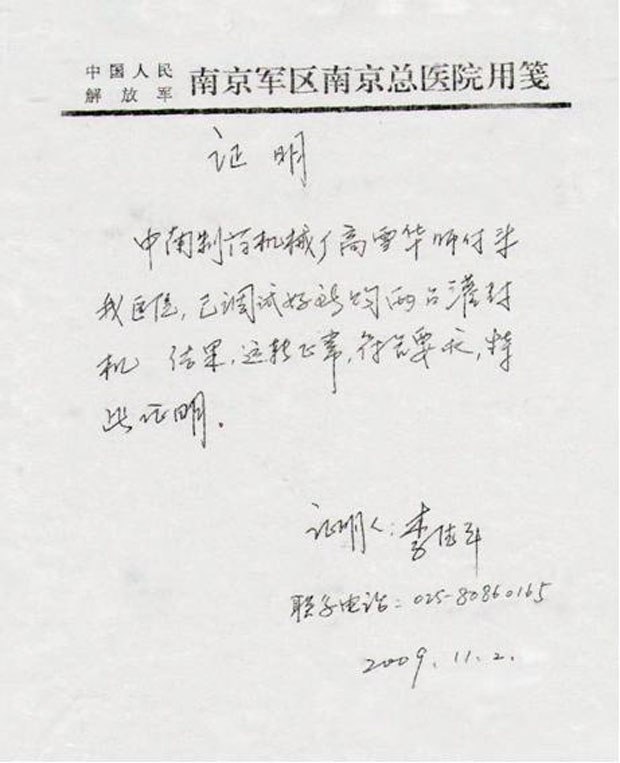 2009年10月,南京軍區南京總醫向我廠購進ALG 5ML 安瓿拉絲灌封機一臺,ALG 10ML 安瓿拉絲灌封機1一臺,我廠調試人員于2009年11月2日到用戶調試并培訓操作人員,機器現已正常投入使用。