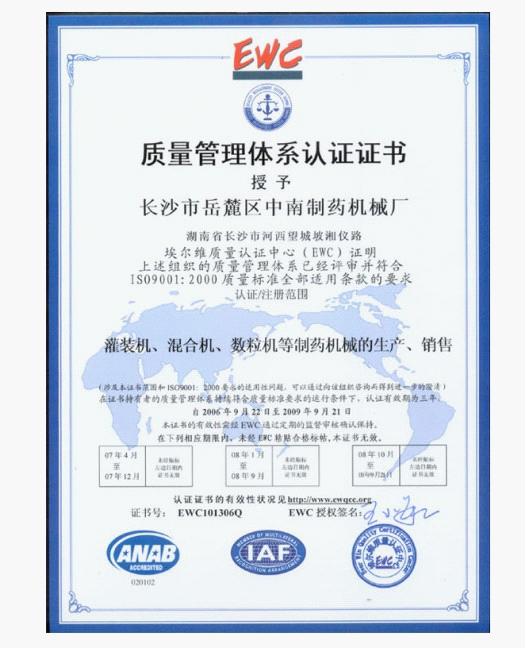 經(jīng)過(guò)3年的努力,我廠認(rèn)真按國(guó)際6S規(guī)范辦事,終結(jié)碩果。2006年9月,EWC國(guó)際認(rèn)證中心對(duì)我廠全方位嚴(yán)格評(píng)審,一舉通過(guò)ISO9001:2000質(zhì)量標(biāo)準(zhǔn)全部適用條款。該證書(shū)的取得,標(biāo)志著我廠全面質(zhì)量管理從此躍上了一個(gè)嶄新的臺(tái)階,也為我廠產(chǎn)品走向世界鋪出了一條綠色通道。