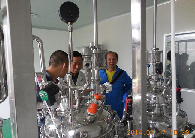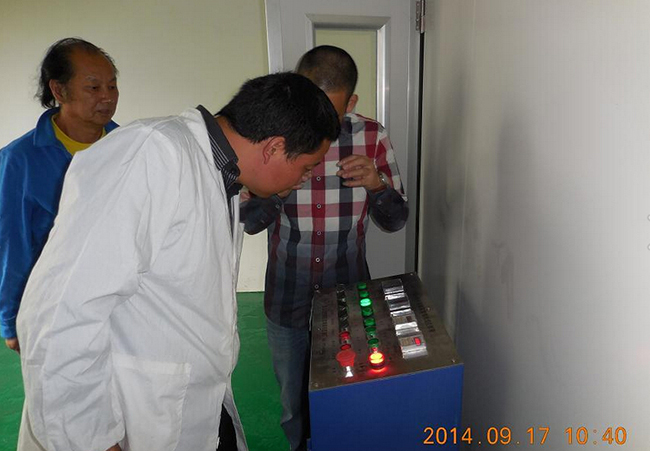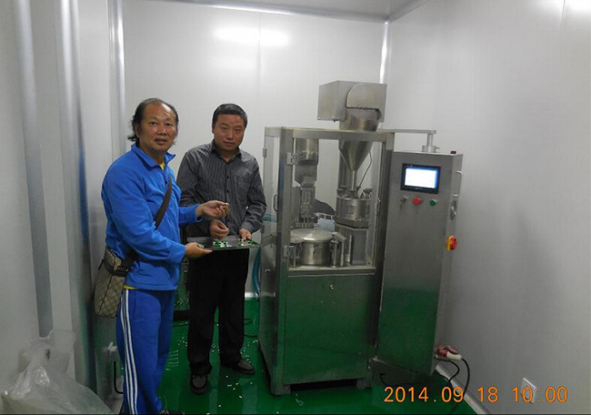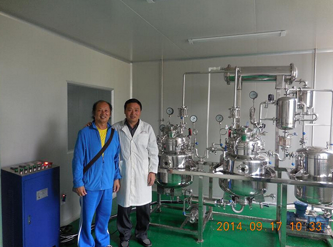 2014年9月17日,湖南省食品藥品學院購買我廠ZNTD-50型提取濃縮液機組、QTB全自動膠囊充填機及其他設備,圖為該院胡文主老師與董事長何家寧先生在驗收現場。