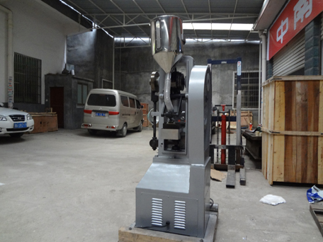 單沖壓片機是通過凸輪(或偏心輪)連桿機構(類似沖床的工作原理),使上、下沖產生相對運動而壓制藥片。單沖式并不一定只有一副沖模工作,也可以有兩副或更多,但多副沖模同時沖壓,由此引起機構的穩定性及可靠性要求嚴格,結構復雜,不多采用。單沖壓片機是間歇式生產,間歇加料,間歇出片,生產效率較低,適用于試驗室和大尺寸片劑生產。