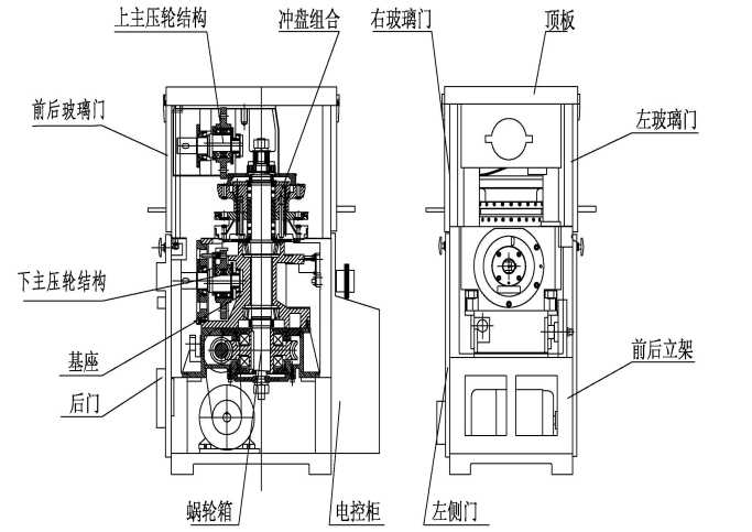 7 罩殼部分:該機外殼為全封閉,符合GMP 要求。上半部分有四扇視窗圍城,便于清掃和維修。下半部分有不銹鋼門封閉,在一般情況下是鎖緊關閉的,只有在維修和安裝沖模時才打開此門。機器的正面安裝一操作臺。壓片室與機器傳動部分由不銹鋼圍罩隔開,保證壓片室清潔及保護傳動零件免受粉末污染、腐蝕。