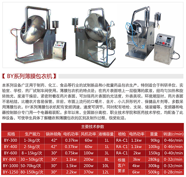 BY系列荸薺式糖衣機,廣泛適用于制藥、化工、食品、研究所、醫院對片劑、藥丸包糖衣、拋光和滾制食品,亦可用于科研單位試制新藥品。