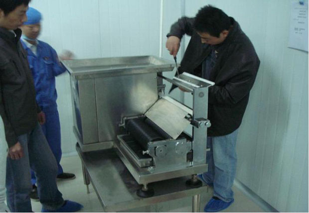 我廠生產的DZ-60型全自動制丸機,主要技術特點有兩點:一是混合物料進入工作腔后,特制螺桿可以將物料再一次擠揉,使從工作腔出來的物料成條形狀好,干濕度、粘稠度合適,便入下一步制丸,如物料出條不,還可以多次擠揉,達到程度。二是制丸成型滾輪可精細調節,便于下條順利和成型美觀。