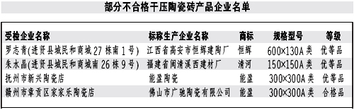 本報訊記者龔漢斌報道:近日,江西省質(zhì)監(jiān)局公布了近期對干壓陶瓷磚產(chǎn)品進行省級產(chǎn)品質(zhì)量監(jiān)督抽查的結(jié)果。質(zhì)監(jiān)部門共抽查了51家生產(chǎn)企業(yè)生產(chǎn)的52批次產(chǎn)品,抽樣合格率90.4%。抽查結(jié)果表明,本次抽查的陶瓷磚其放射性核素限量指標(biāo)均達到了標(biāo)準(zhǔn)規(guī)定的要求;但仍有部分產(chǎn)品存在一些問題。