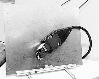 在展臺(tái)上,記者看到一個(gè)像壁虎一樣吸附在鐵板上爬行的機(jī)器,不禁問道:它能干什么?