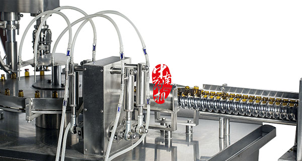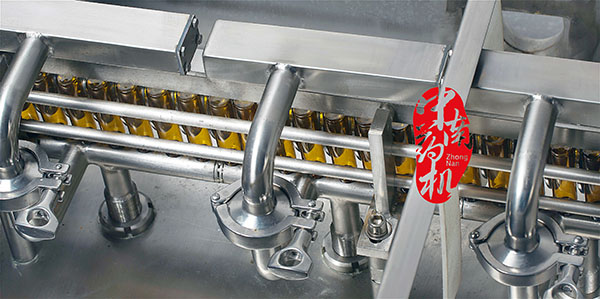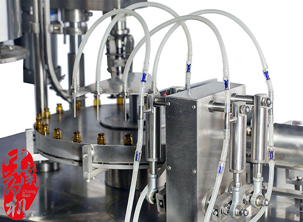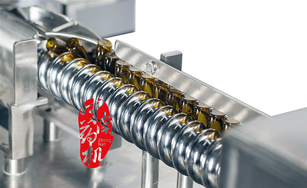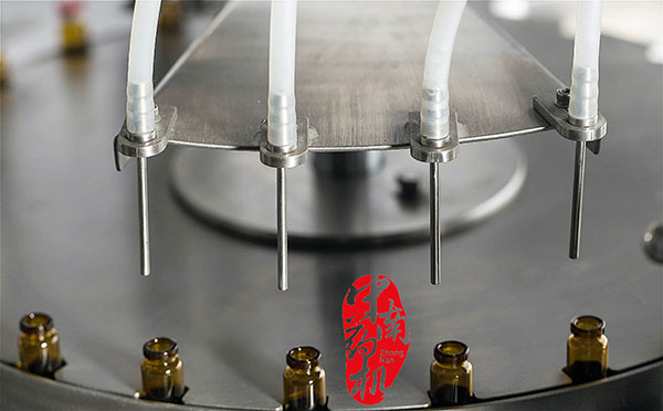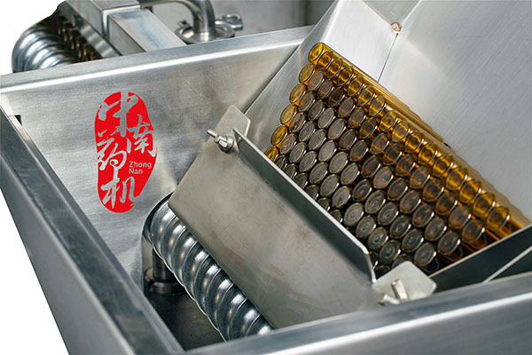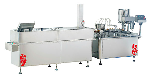 瓶子經(jīng)自來水(或回用水)及去離子水內(nèi)外沖洗,再由凈化壓縮空氣吹去表面的水珠,然后進入烘干段烘干。瓶子出烘箱,進入灌封機進行灌裝軋蓋??膳c燈檢機,貼標機等設(shè)備連線。符合GMP要求。